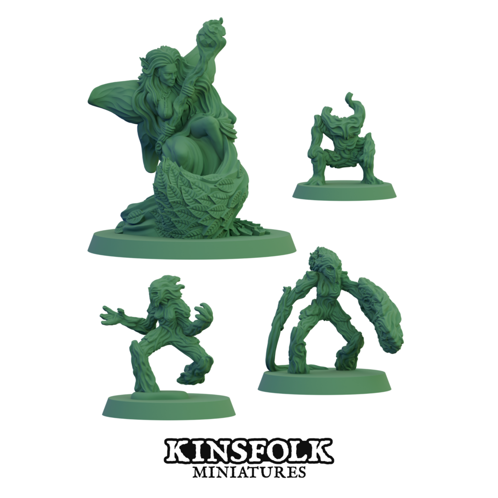 A hamadryad is an old tree spirit with a deep connection to the natural world. The Bloomdancer in particular gathers the woodfolk through magical song and dance in defence of their home. Two dryads answer her call and a cheeky little wood sprite tries their best to keep up.